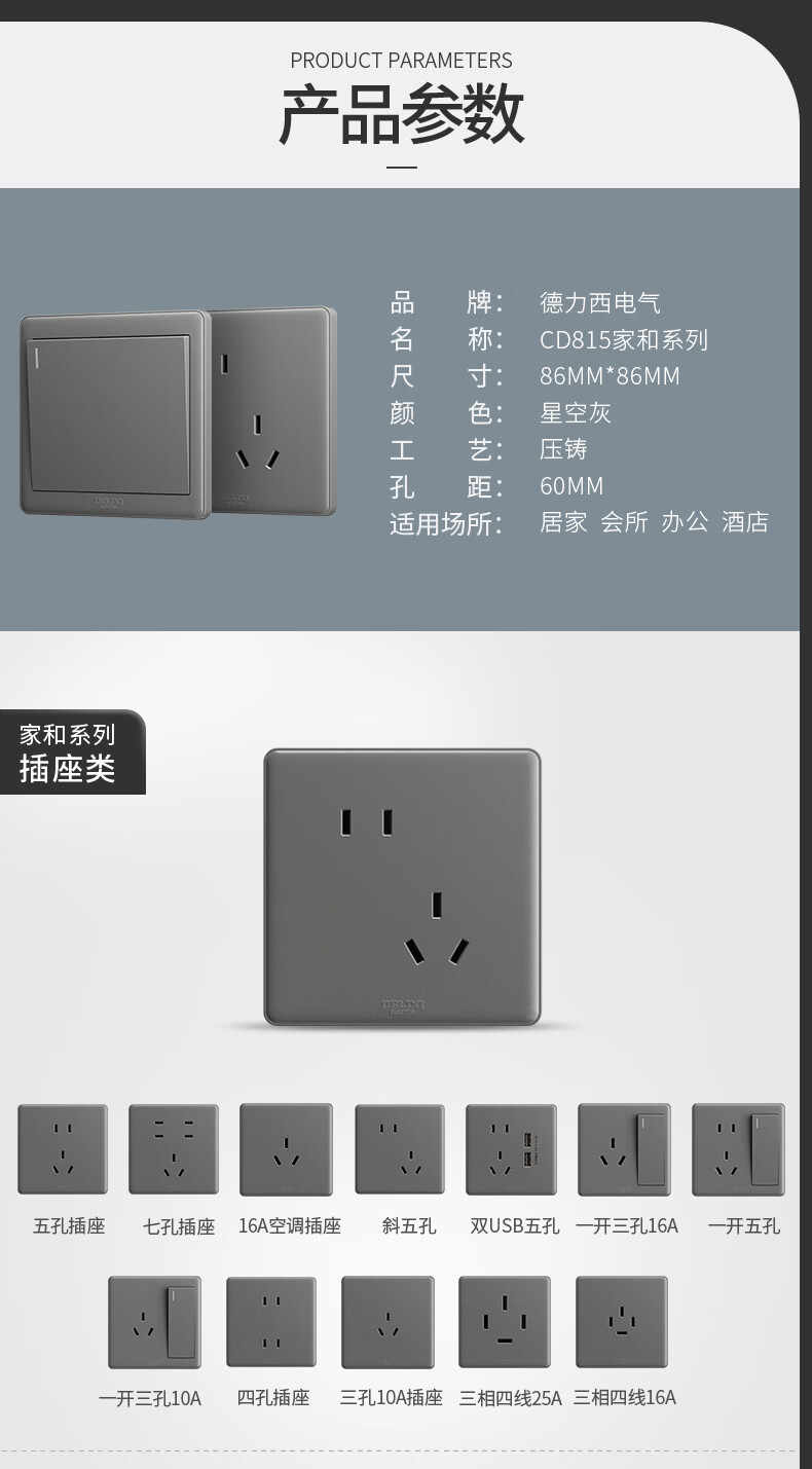 德力西(DELIXI)带开关插座86型家用暗装墙壁电源 CD815官方灰色哑光全屋家装套餐 一开双控五孔(1开5孔控制) 官网星空灰色家用装修大面板