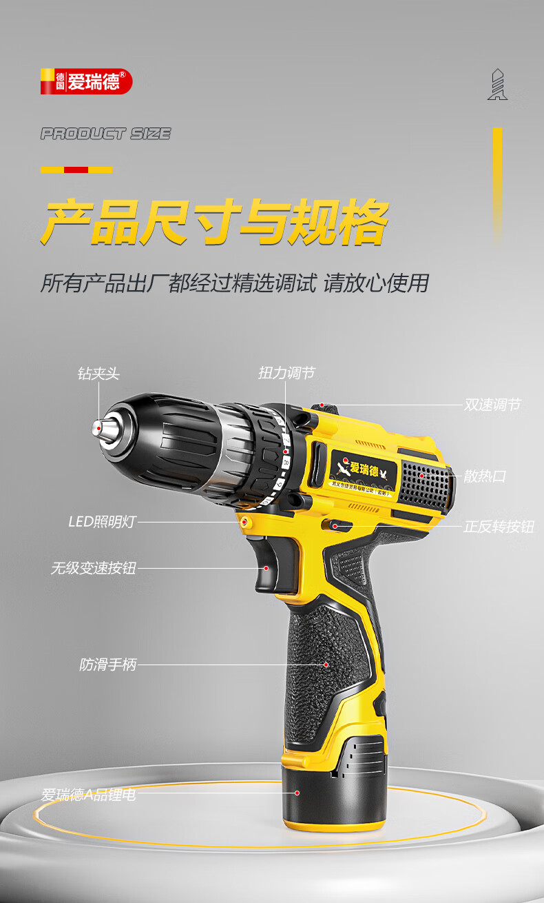 爱瑞德 德国手电钻家用多功能电动螺丝刀充电电钻电起子 电动工具 12V双速款配二电一充