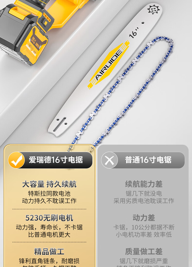 爱瑞德16寸充电电锯家用电链锯锂电池切割机多功能伐木锯大功率砍树锯 无刷16寸168VF二电一充