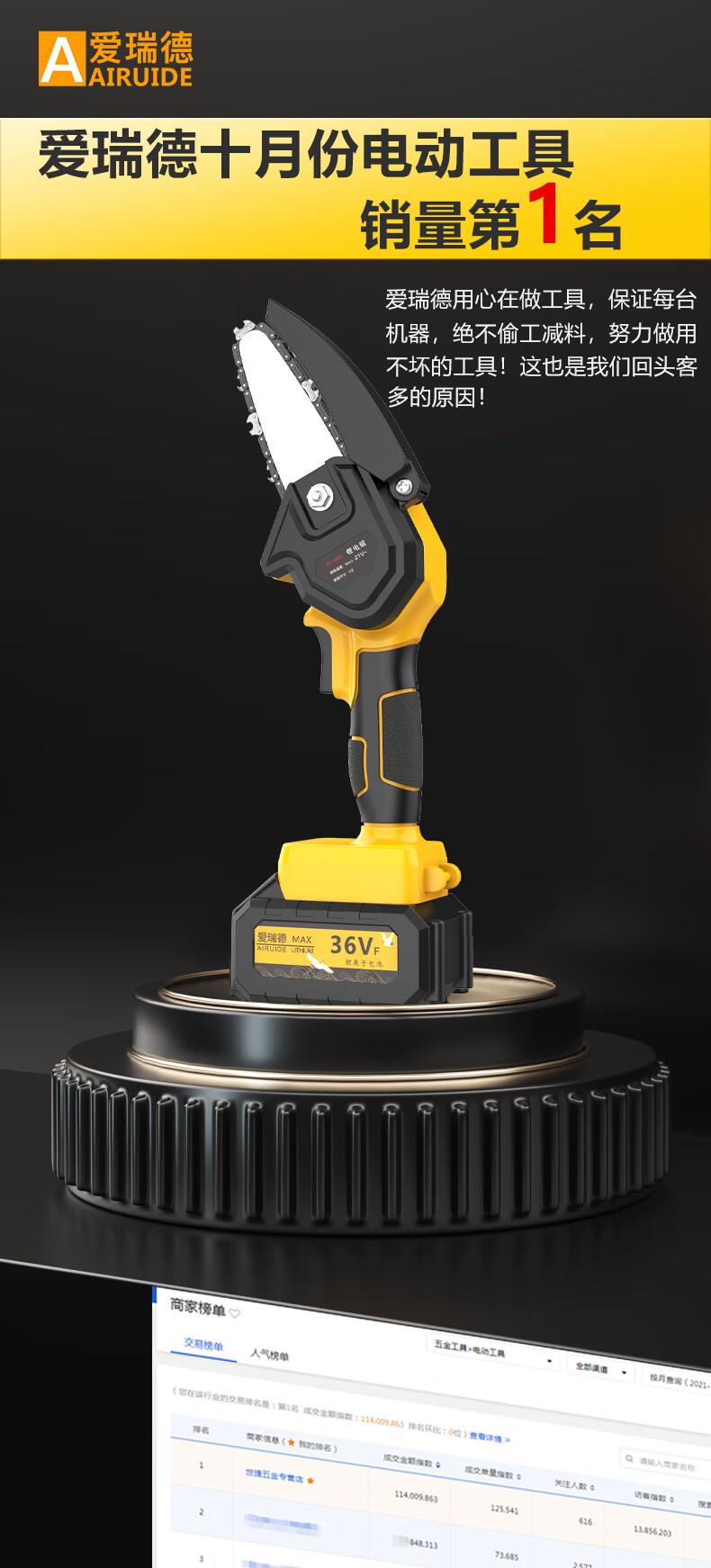 爱瑞德12寸锂电锯家用充电电锯无刷电链锯伐木锯手持切割机电动工具 无刷12寸二电一充配双链条