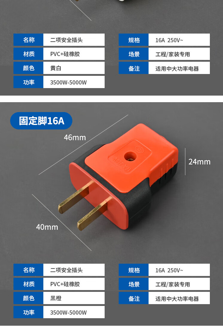 南戒家用电源插头纯铜插头二脚16A大功率2孔插头插座多功能多孔转动插 T型蓝白【固定】二脚插头 1个装